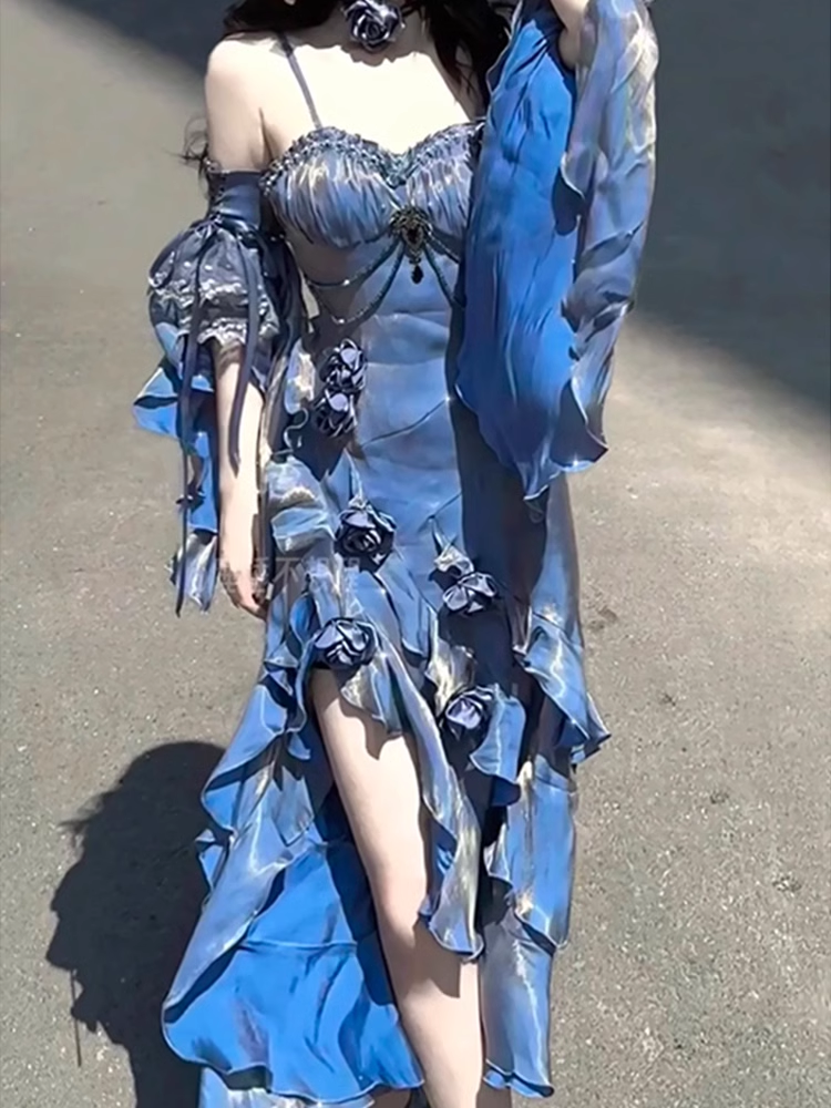 Niulatu Sheath Irregular Ruffled Spaghetti Straps Women's Blue Long Birthday Party Dresses SD436