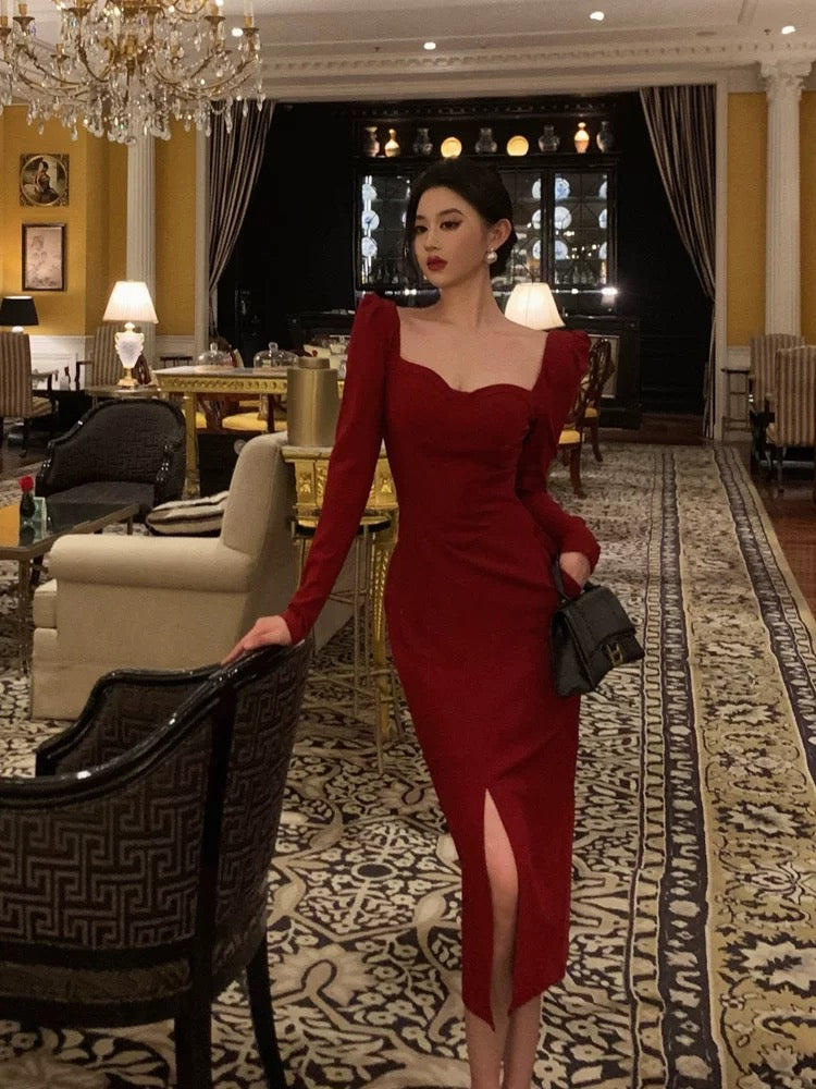 Niulatu Sheath Strapless Red Slit Prom Dresses Beads Birthday Outfits Evening Gown SD954