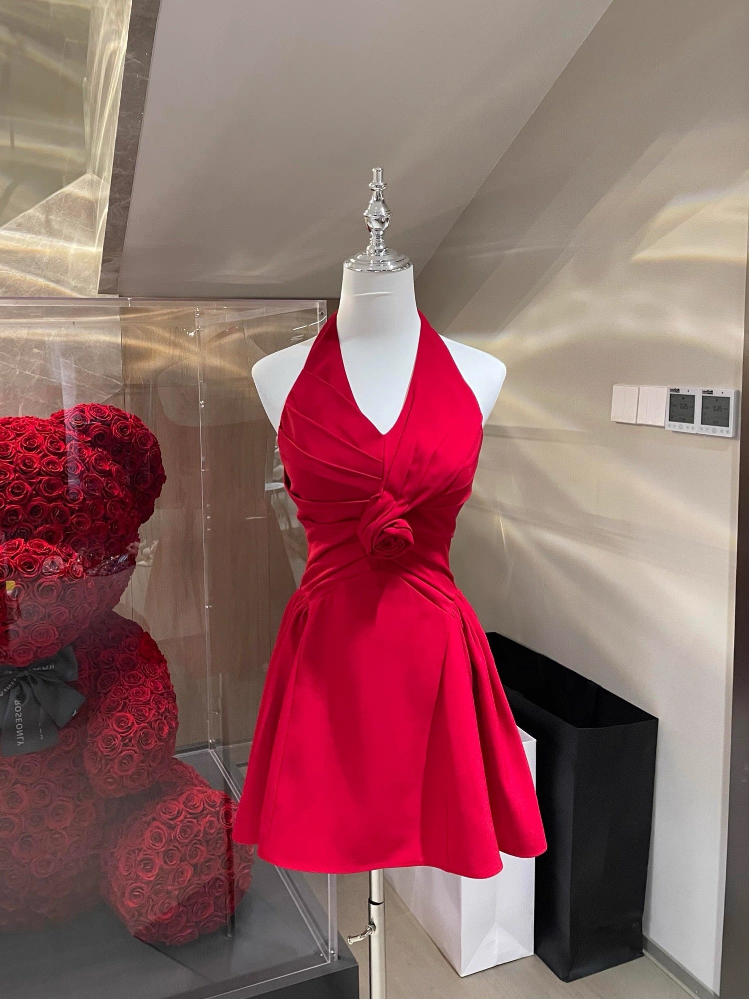 Simple A Line Halter Red Chiffon Floral Short Formal Homecoming Dresses Party Graduation Dress Hoco Dresses HZ1121
