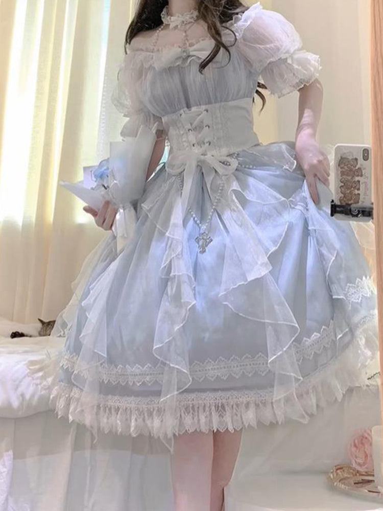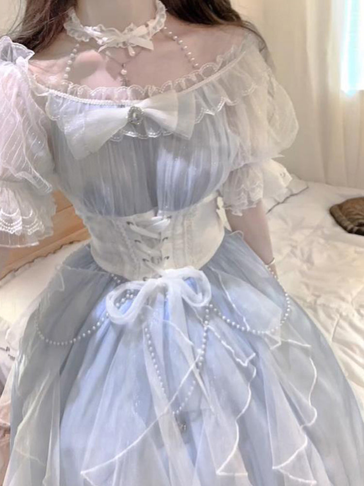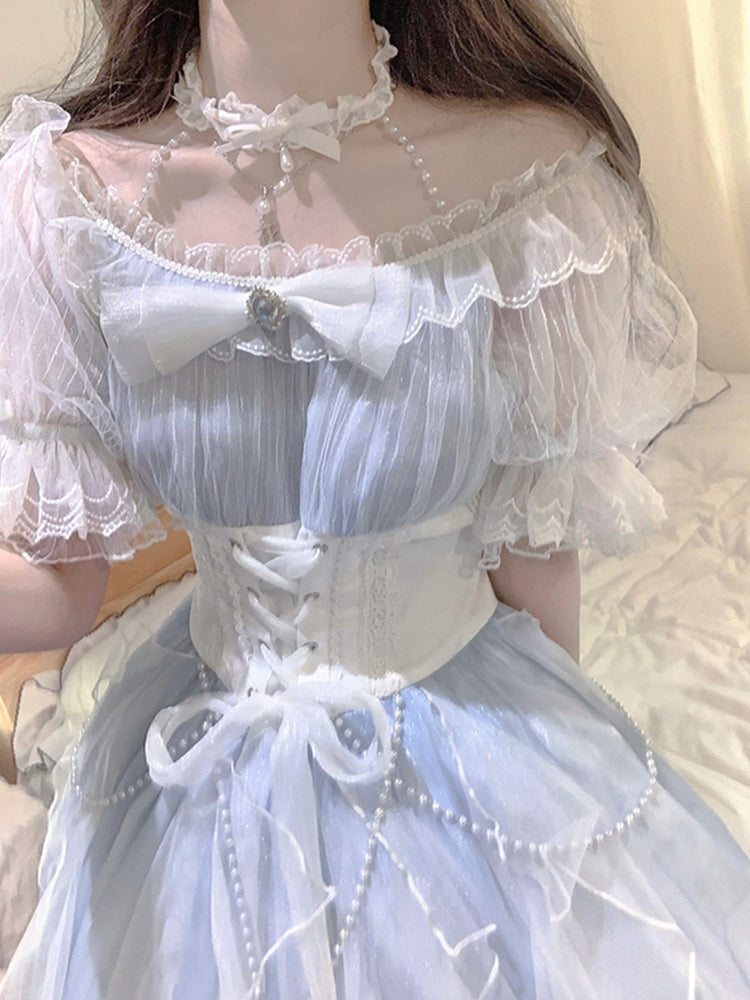 Vintage Ball Gown Off The Shoulder Blue Short Summer Holiday Dresses 16th Birthday Dress Lolita Dress White Birthday Outfits HZ1214